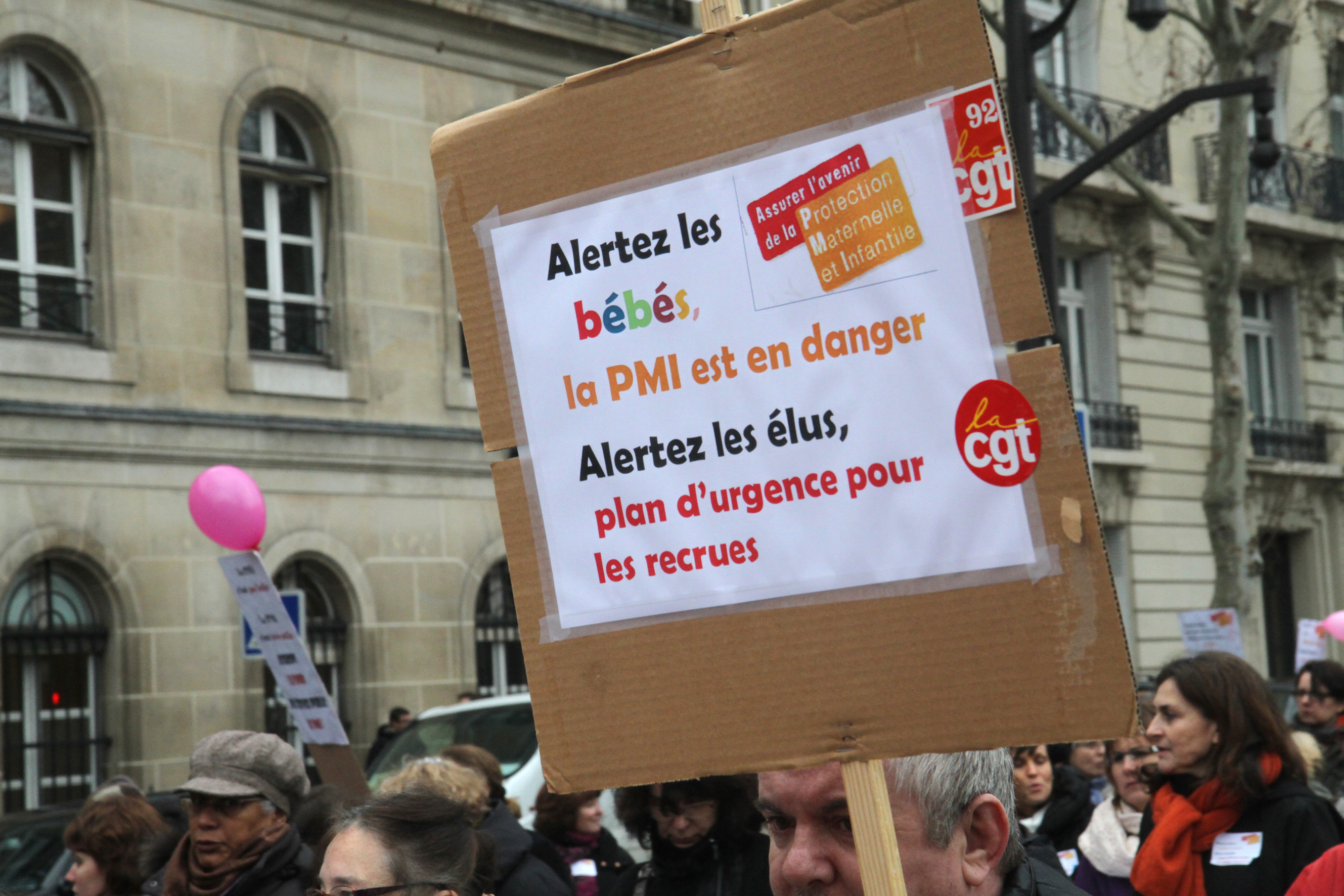 Télécharger la photo “Pancarte Alertez les bébés, la PMI est en danger”