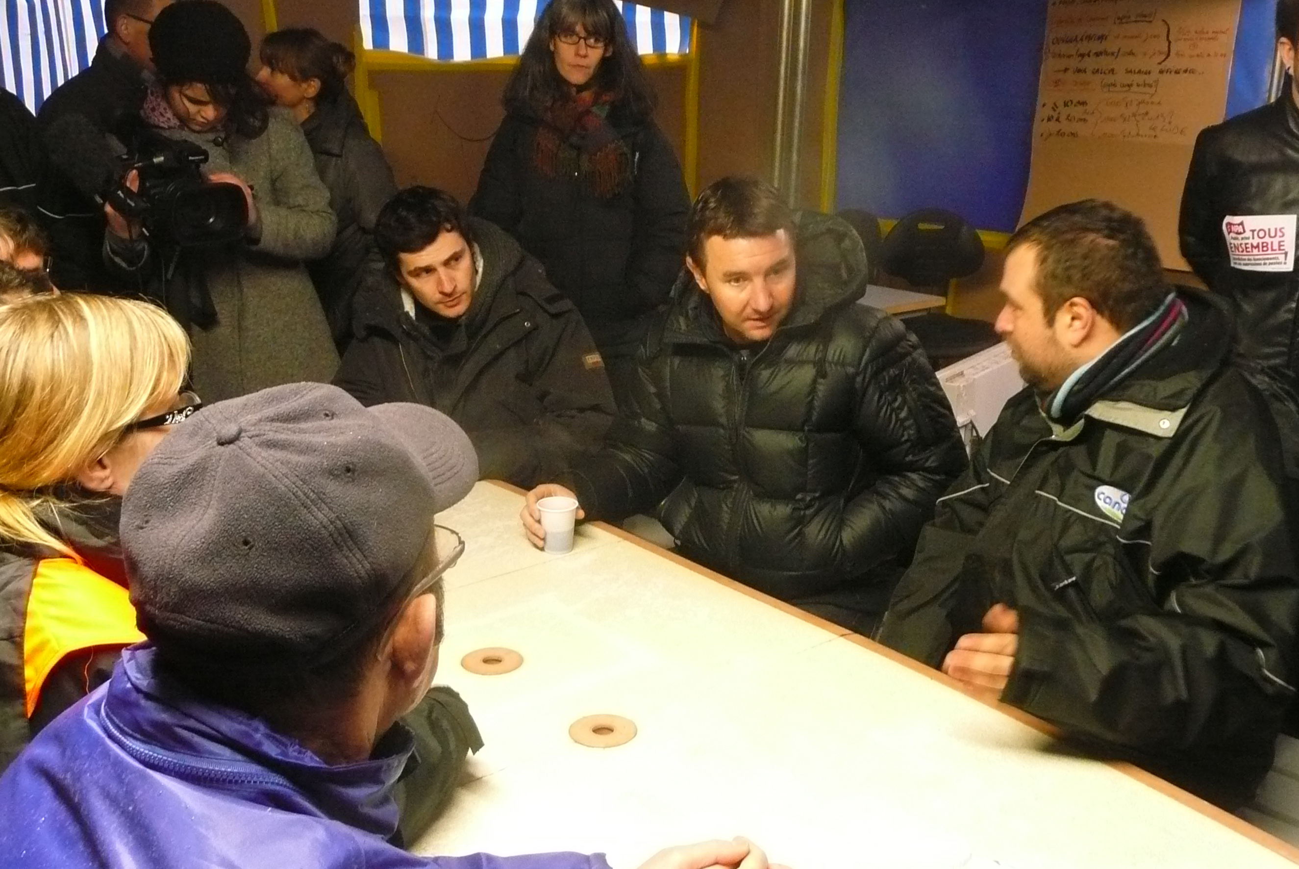 Télécharger la photo “Olivier s'entretient avec les salariés qui mènent la grève et l'occupation.”