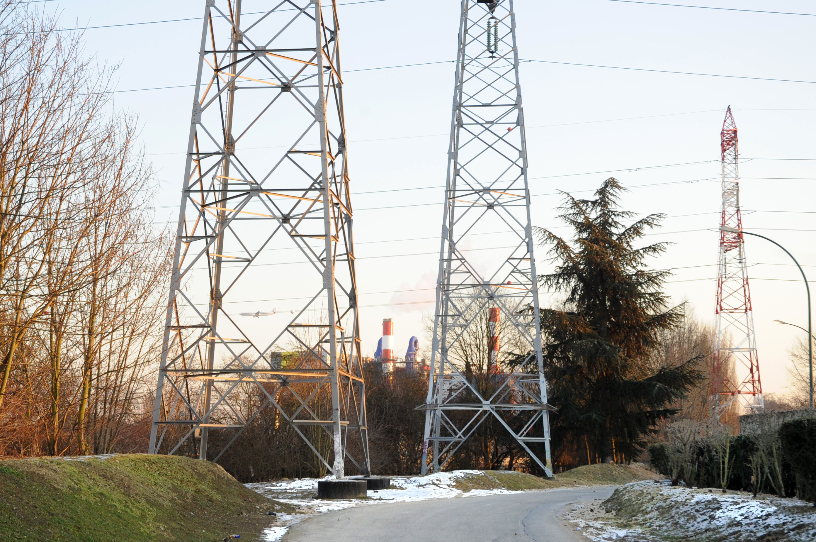 Télécharger la photo “Pylones électriques et chauffage urbain distribution de l'énergie”
