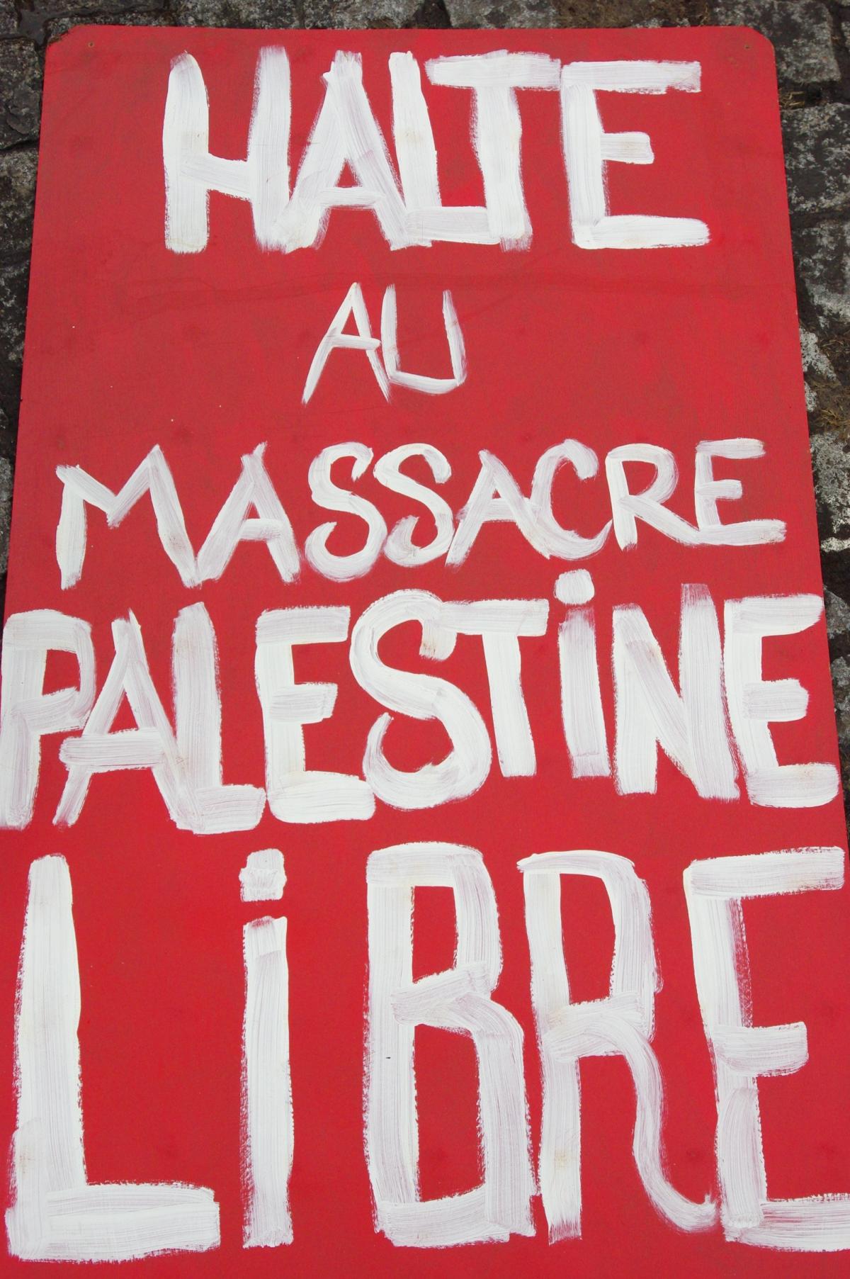 panneau Halte au massacre en Palestine libre