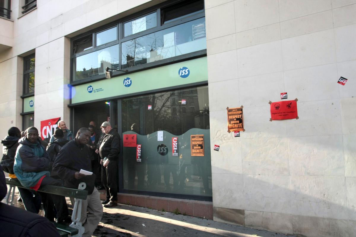 26 octobre 2009. Paris 12°. Des vigiles tiennent la porte d'entrée de la société de nettoyage SSI. Les salariés sans-papiers sont en grève. Une quinzaine sont à l'intérieur. A l'extérieur un groupe de soutien et de salariés. La direction de la société joue la tension avec les grévistes et des incidents graves auront lieu un peu plus tard.
