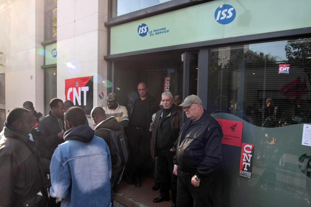 26 octobre 2009. Paris 12°. Des vigiles tiennent la porte d'entrée de la société de nettoyage SSI. Les salariés sans-papiers sont en grève. Une quinzaine sont à l'intérieur. A l'extérieur un groupe de soutien et de salariés. La direction de la société joue la tension avec les grévistes et des incidents graves auront lieu un peu plus tard.