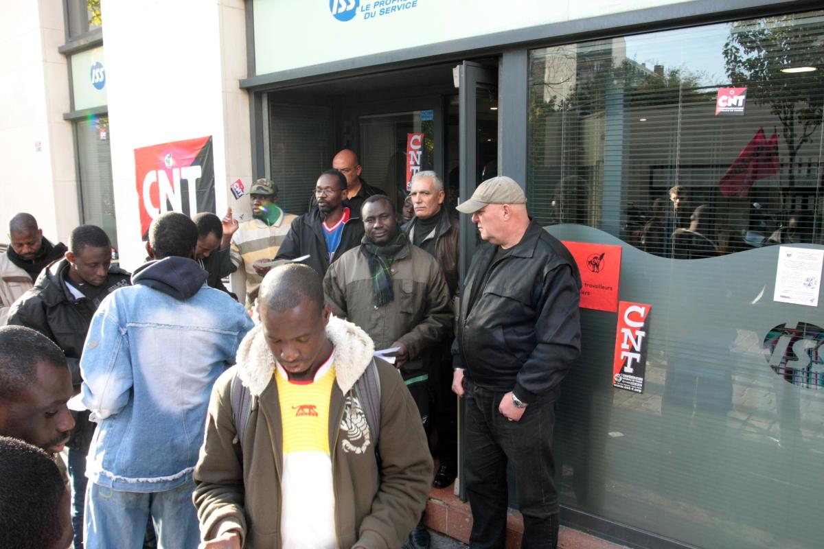 26 octobre 2009. Paris 12°. Des vigiles tiennent la porte d'entrée de la société de nettoyage SSI. Les salariés sans-papiers sont en grève. Une quinzaine sont à l'intérieur. A l'extérieur un groupe de soutien et de salariés. La direction de la société joue la tension avec les grévistes et des incidents graves auront lieu un peu plus tard.