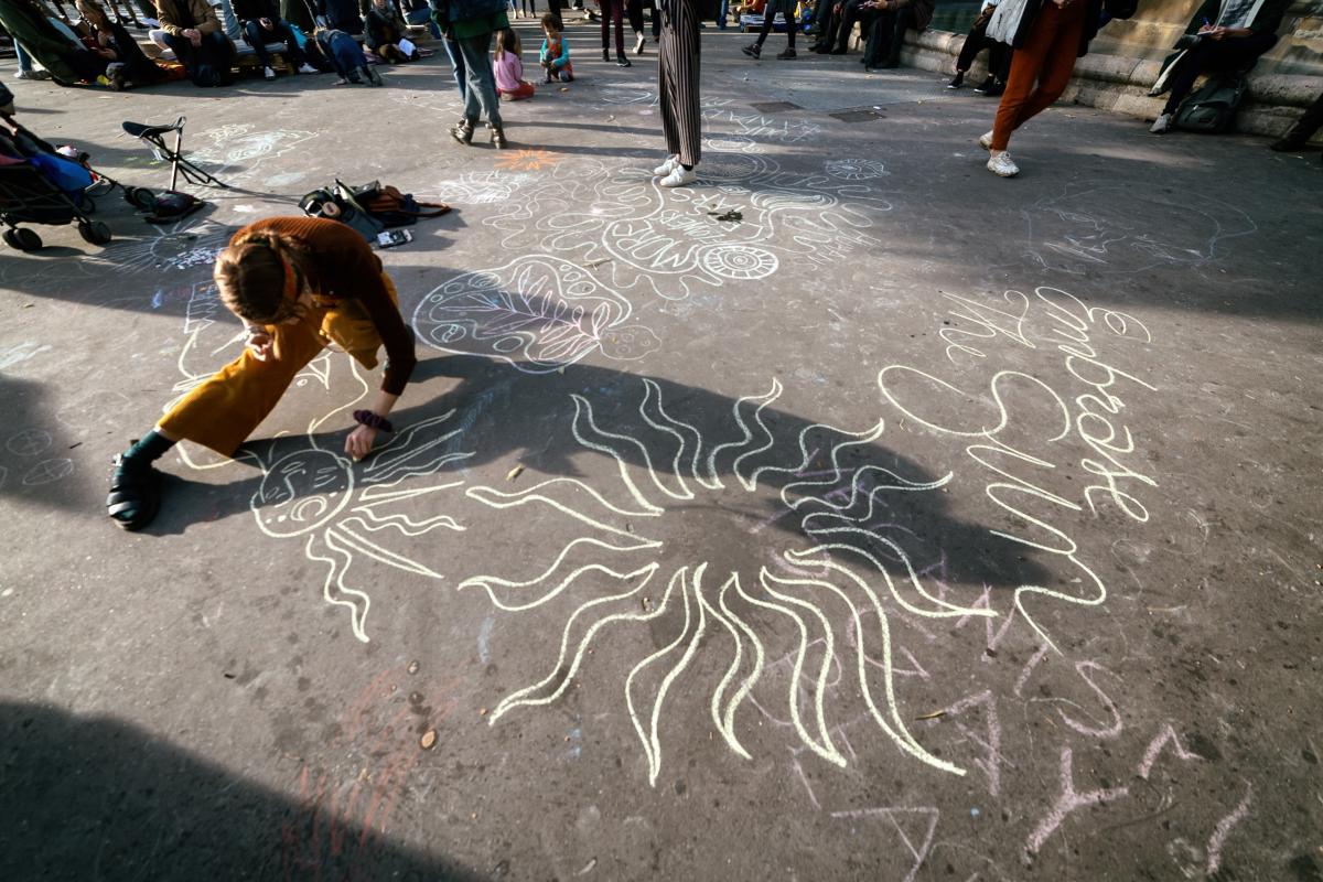 Une activiste dessine sur le sol de la place du chatelet, dernier jour du blocage de la place du chatelet par les militants d'Extinction Rebellion, Paris, 11 octobre 2019.