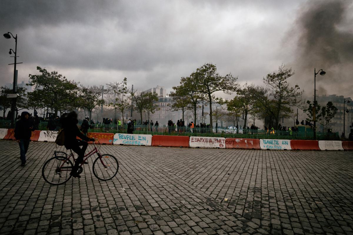 Tags, smoke and tear gas in Place d'Italie, Paris, november 16 2019.