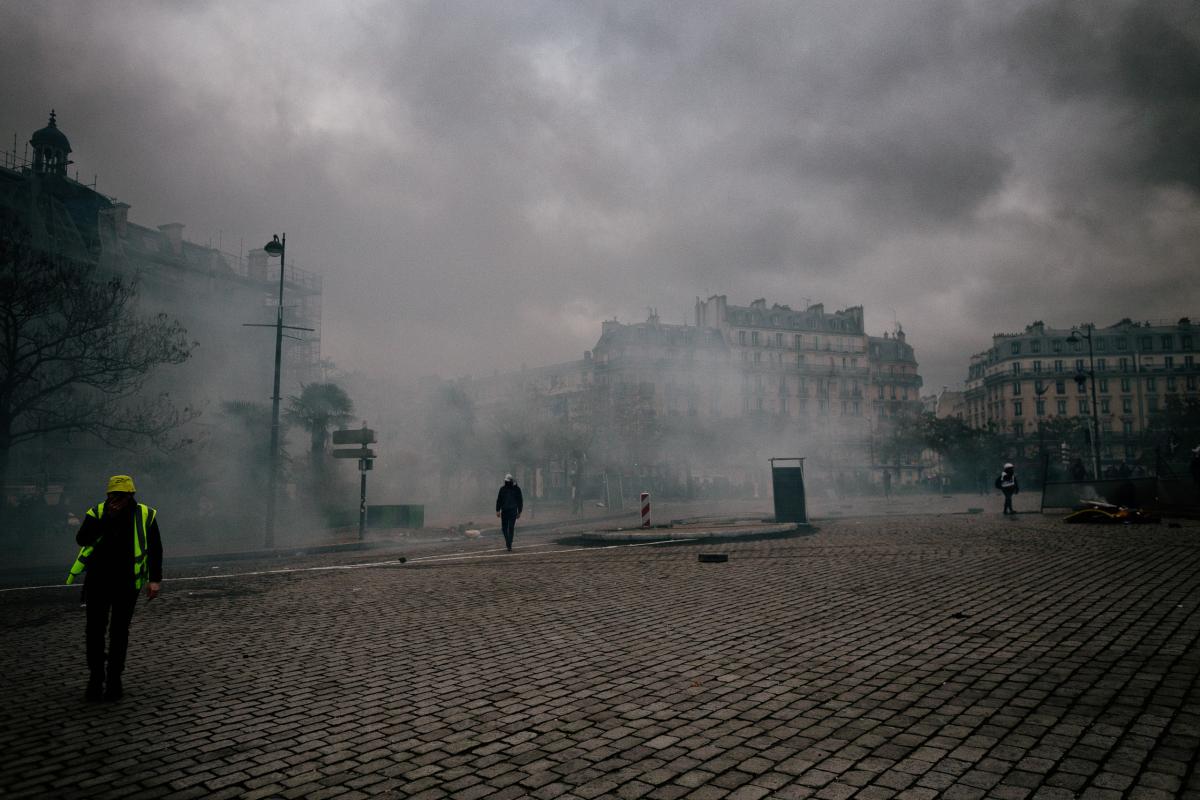 Quelques manifestants dans un nuage de gaz lacrymogene, Paris, 16 novembre 2019.