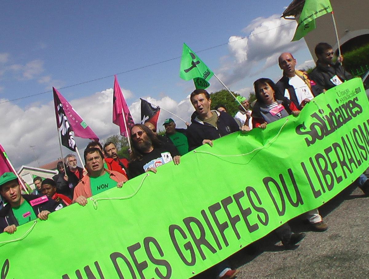 Action contre le passage du train privé de la Connex à Dugny dans l'Est de la France à l'appel de Sud-rai,l avec Olivier Besancenot et Annick Coupé (Solidaires). Dugny/16/09/2005/DR.