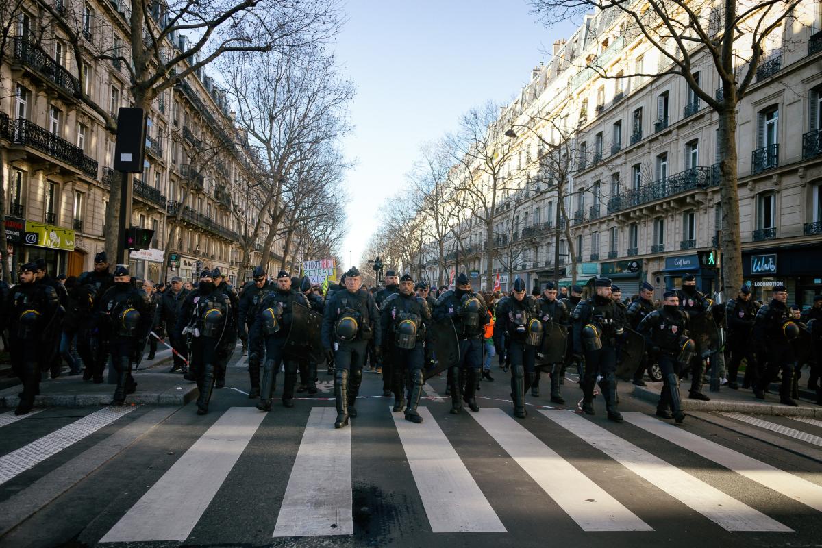 La manifestation est fortement encadree par des CRS, manifestation contre la reforme des retraites, Paris, 6 fevrier 2020.