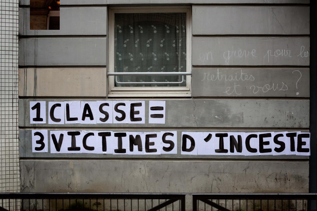 France, Paris, 2021-02-01. Feminist collage with the slogan "1 class = 3 victims of incest". Photograph by Martin Noda / Hans Lucas.