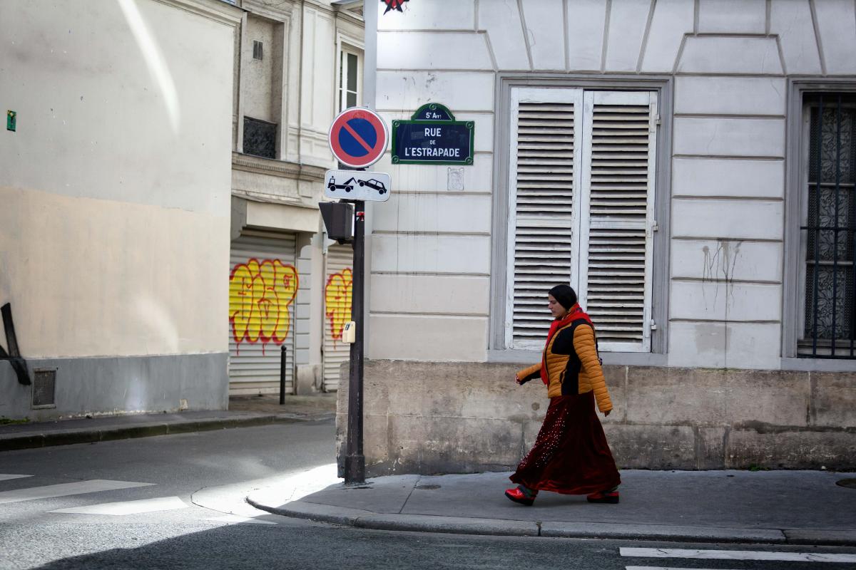 France, Paris, 2021-02-17. A woman in Roma clothing walks down the street. Photograph by Martin Noda / Hans Lucas.
