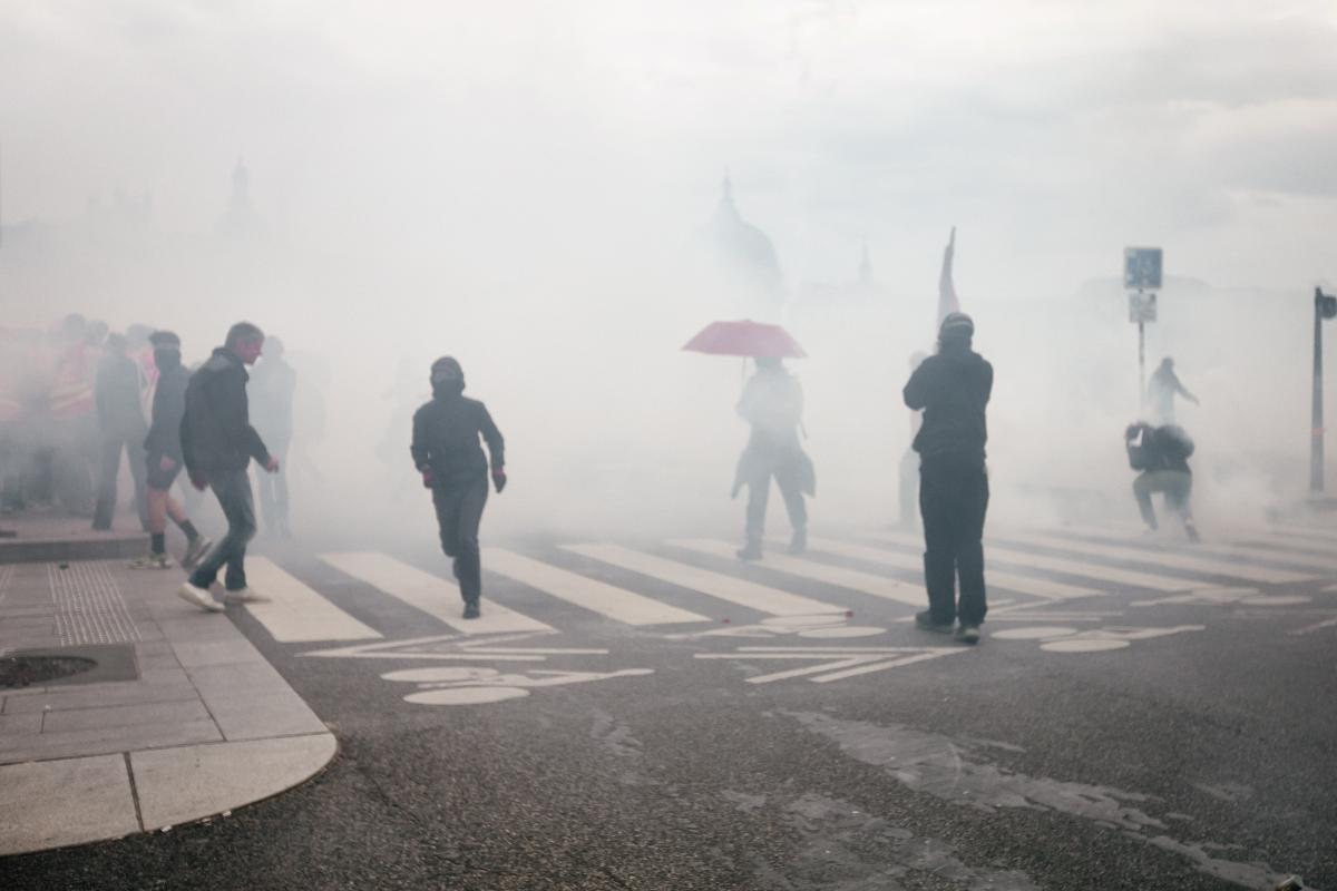 France, Paris, 2023-05-1. Demonstrators in a cloud of tear gas. May day demonstration against pension reform. Photograph by Martin Noda / Hans Lucas