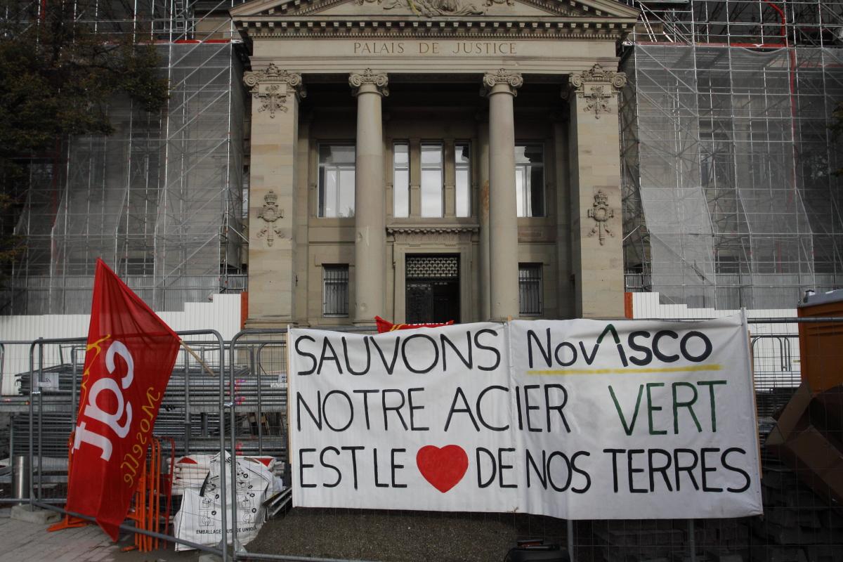 France, Strasbourg, 31-10-2025: la banderole "Sauvons Novasco" est déployée devant le Palais de Justice
