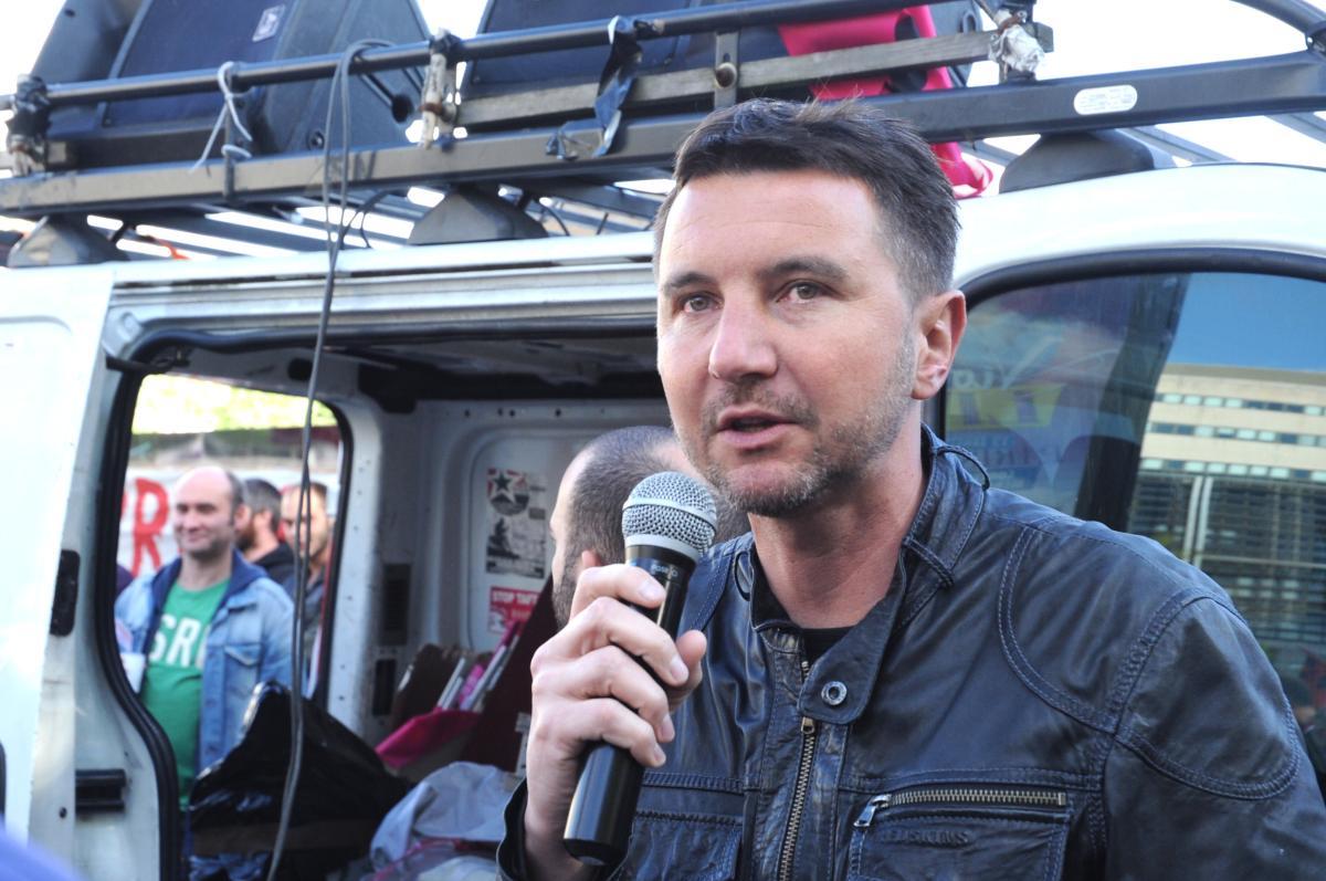Olivier Besancenot au rassemblement devant le Ministère des finances pour demander la réintégration de Yann Le Merrer