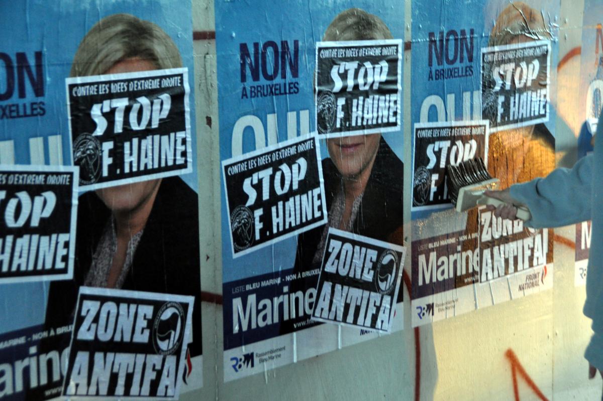 Affiches du FN recouverte par des affiches antifa