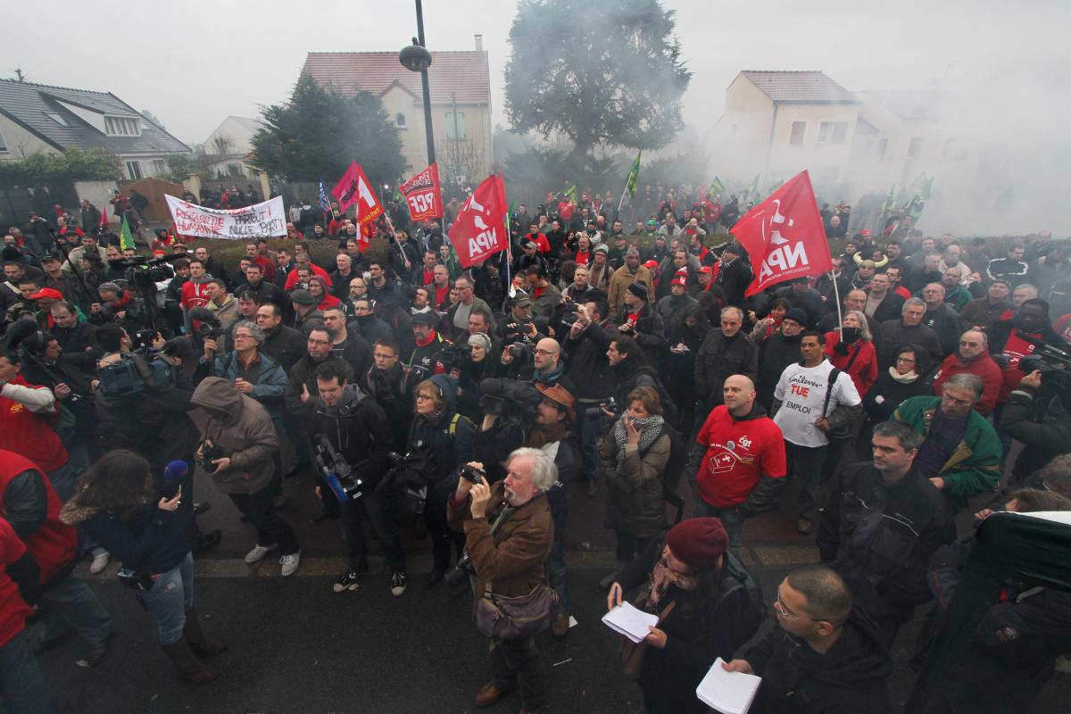 Le 7 mars 2013, rassemblement des salariés de Goodyear devant le siège de l'entreprise à Rueil Malmaison, à l'occasion d'une réunion du CE où doit être rendu le rapport des experts sur la situation du groupe.