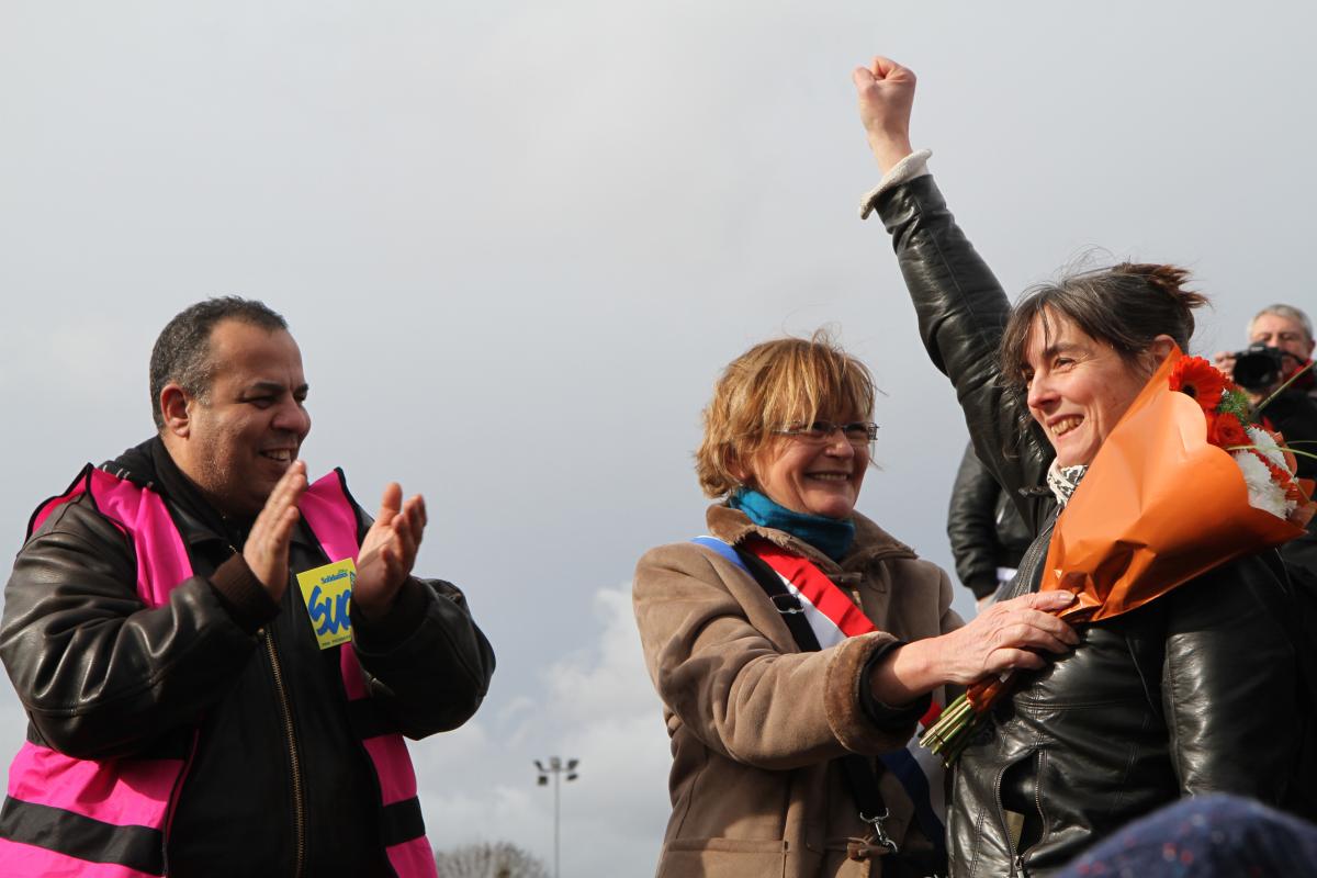Marie Georges Buffet offre un bouquet à Agathe Martin, militante CGT mise à pied.