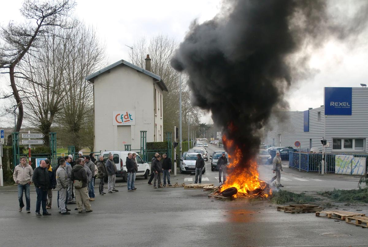 Au Mans le 5 fevrier 2013, débrayage et rassemblement de 500 personnes. Un grand feu de pneus et palettes devant lentrée de lusine. Ensuite un défilé sur la rocade et une prise de parole devant le domicile de Stéphane le Foll, ministre de lagriculture et élu de la ville.