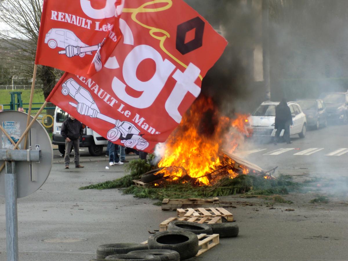 feu de palettes et drapeaux CGT Renault