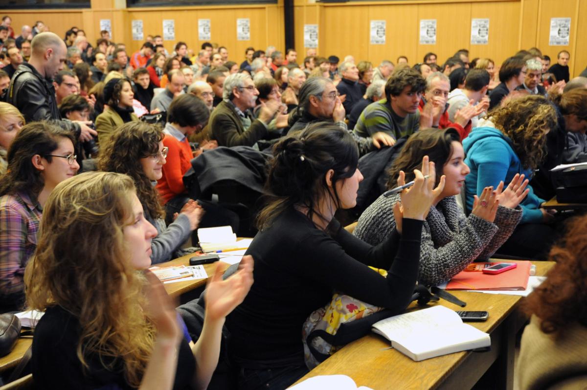 Meeting pour la convergence des luttes avec des représentants dentreprises menacés par des suppressions demplois, Sanofi, PSA, Goodyear, 3 Suisses, Virgin, Renault, Air France, Presstalis. 24janvier 2013 Paris