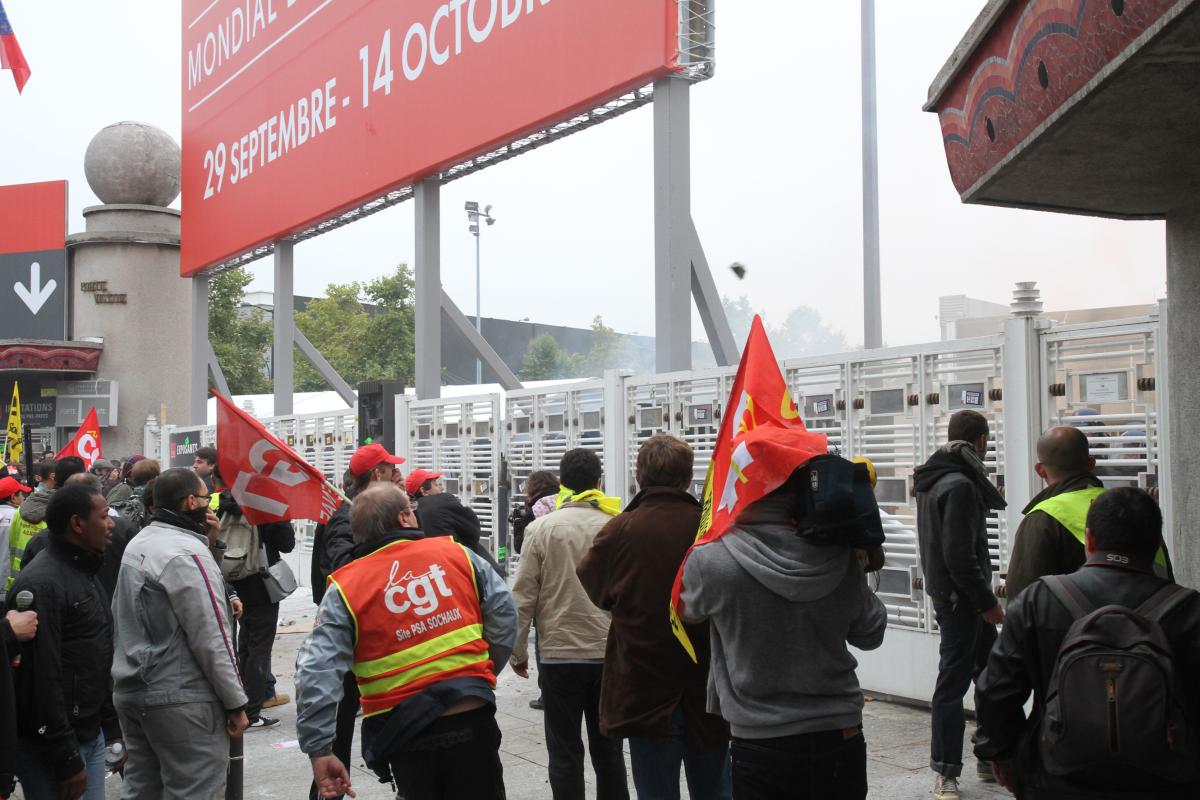 Le mardi 9 octobre 2012, les salariés de PSA, Arcelor Mittal, Renault, Goodyear..., interdits de Mondial de l'Automobile par des forces de police massivement présentes, tentent de forcer l'accès du salon.