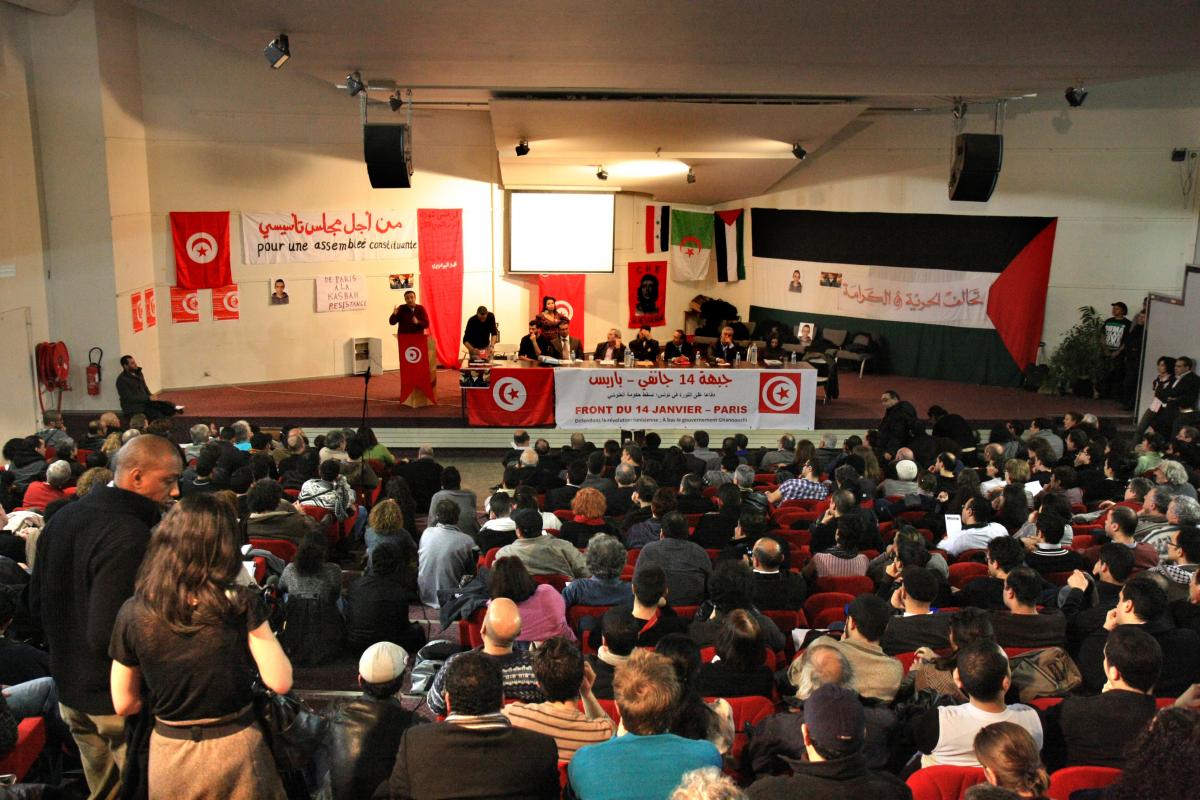 Le 23 février 2011 meeting à l'appel du front du 14 janvier en soutien aux révolutions en cours en Tunisie, Egypte, Lybie, ...à la bourse du travail de Saint-Denis.