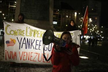 France, Strasbourg,03-01-2026:une militante du NPA prend la parole devant la foule rassemblée place Kléber
