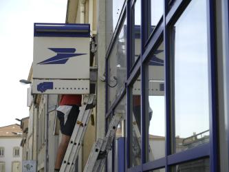 Enseigne de la Poste en cours de démontage