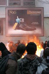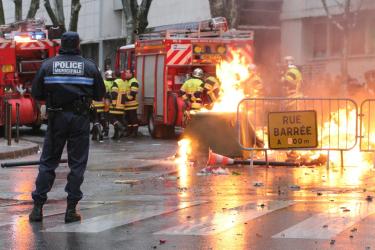 Jeunes regardant un incendie dans la rue au cours d'une manifestation lycéenne.
