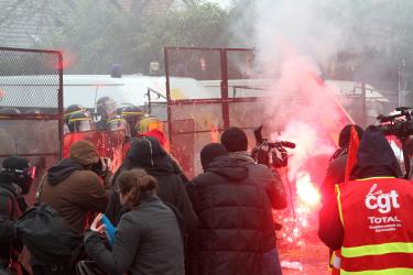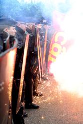 Cordon de CRS et drapeau CGT