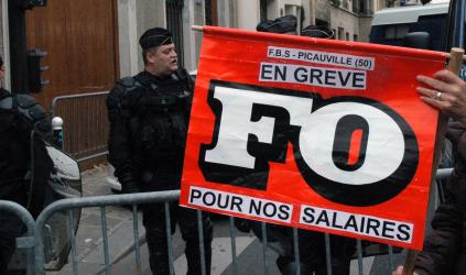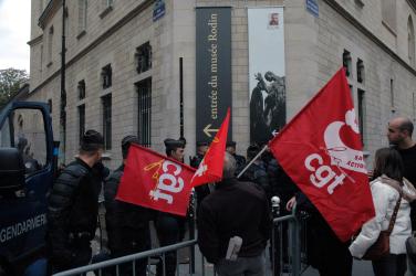 Manifestants CGT santé avec leurs drapeaux devant des CRS bloquant les accès au ministère du Travail.