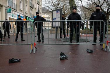 Policiers derrière une barrière avec chaussures au sol