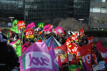 Drapeaux des syndicats Sud énergie Solidaires, devant la Défense Paris.