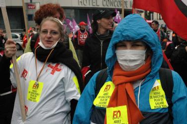 Manifestants CGT santé avec leurs drapeaux devant des CRS bloquant les accès au ministère du Travail.