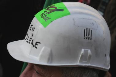 Syndicaliste SUD Rail avec un casque