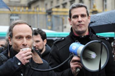 Le secrétaire de la Cgt spectacle annonce la relaxe de Loïc Canitrot devant le palais de justice Paris