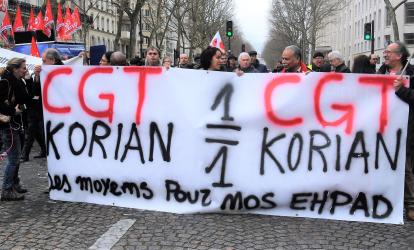 Banderole Cgt Korian entreprise de gestion de maisons de retraite médicalisées (EHPAD) et cliniques spécialisées (SSR)