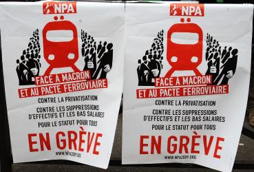 Affiche du Npa Face à Macron et au pacte Ferroviaire contre la privatisation Grève