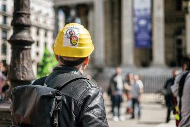 Un cheminot avec un casque et un autocollant regarde La Bourse