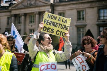 Une cheminote en grève écoute l'intervention lors du rassemblement devant la Bourse