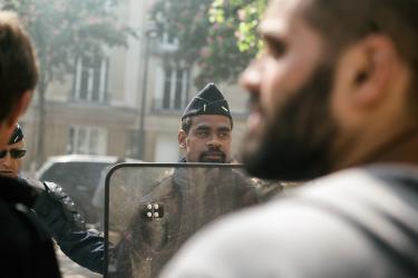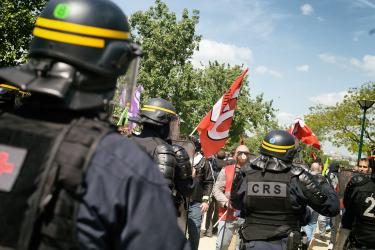 Un CRS pointe du doit un cheminot parce qu'il avait un fumigène