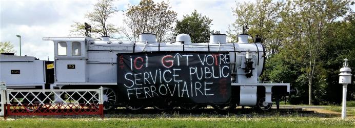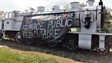 Banderole Cheminots de Périgueux en lutte ici git votre service public Ferrovière