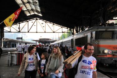 Arrivée de salariés de Ford Blanquefort à Austerlitz, sous l'oeil d'un cheminot, et d'un drapeau CGT.