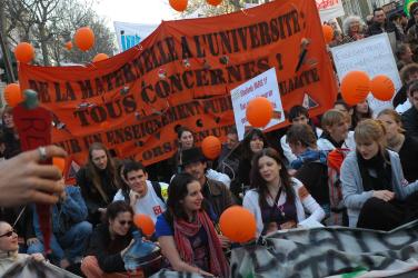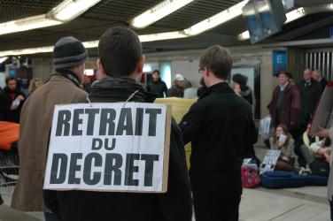 Etudiants en grève suivant un cours dans la Gare de Lyons.