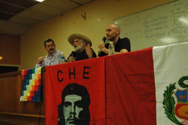Hugo Blanco à la tribune avec drapeau de Che Guevara.