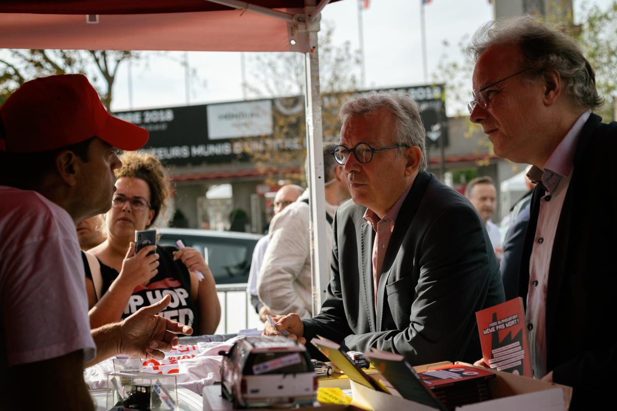 Pierre Laurent et Jacques Baudrier discutent avec un travailleur de Ford