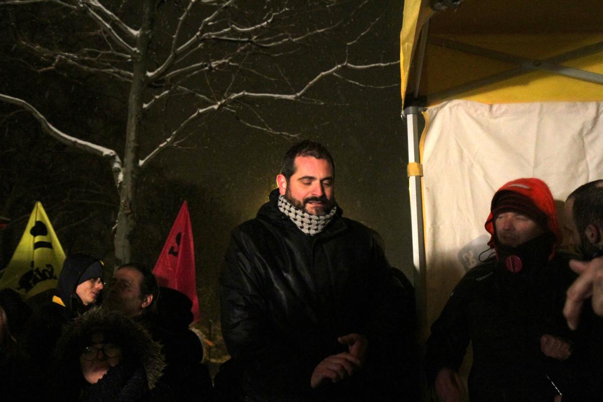 Paris, le 6 février 2018, rassemblement contre la menace de licenciement de Gaël Quirante par La Poste, sous une tempète de neige.