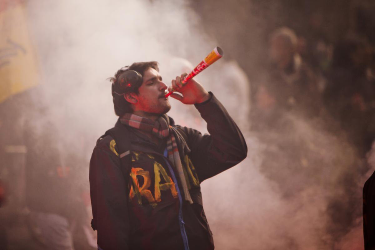 Paris durant la manifestation contre la réforme des retraites du 28 octobre 2010. Un manifestant souffle dans une trompette sur fond de fumigène.
