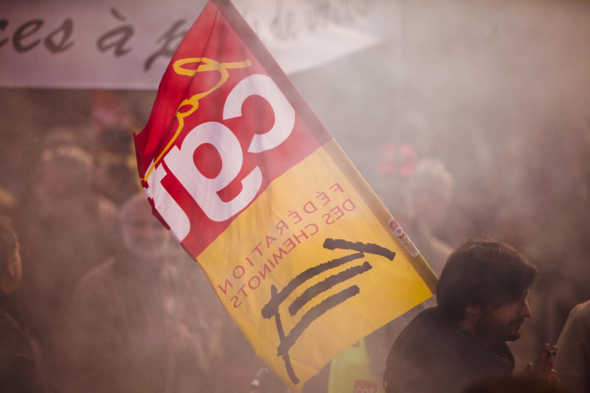 Drapeau CGT sur fond de fumigène en manifestation.