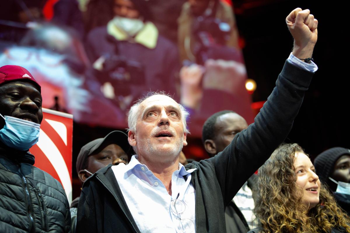 France, Paris, 2022-04-02. Philippe Poutou chante l internationale le poing leve. Meeting de Philippe Poutou au Cirque d hiver. Photographie de Martin Noda / Hans Lucas