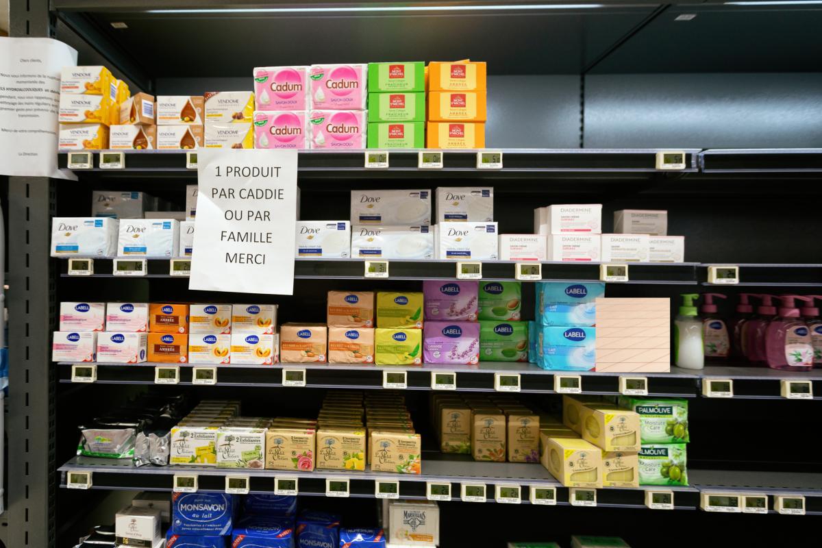 Un supermarche, pour faire face a la penurie, met de limites a la quantite de savon que les clients peuvent acheter, Soorts-Hossegor, 17 avril 2020.